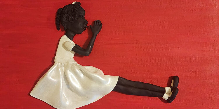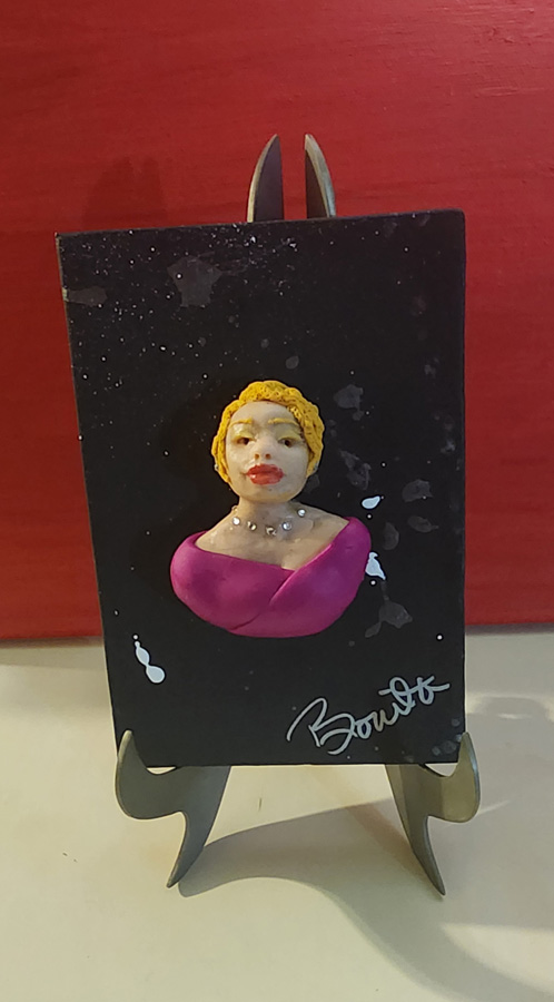 Also polymer pieces on canvas frames are $300 and up. Her colorful, 3-D sculpted figures often capture memories from her childhood, such as “little girl dresses with black shoes and white socks.”