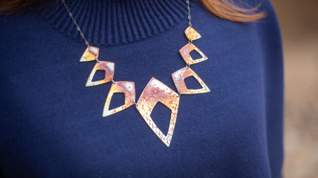 North Carolina metalsmith Annie Grimes Williams creates colorful enameled jewelry inspired by patterns and textures in nature as well as Mid-Century Modern designs. Artist: Born in Winston-Salem, NC, Williams grew up in Welcome, NC, a suburb. She graduated with a BFA in metal design in 2003 from East Carolina University. After graduating, she worked as…